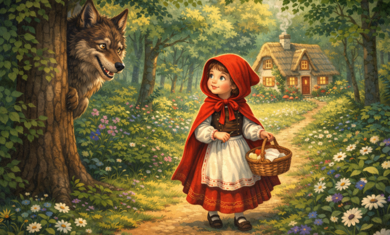 Orman çok güzelmiş. Kuşlar ötüyor, çiçekler rengârenk açıyormuş. Kırmızı Başlıklı Kız bu güzelliklere bakarken, karşısına kurnaz bir kurt çıkmış. Kurt, tatlı bir sesle sormuş: