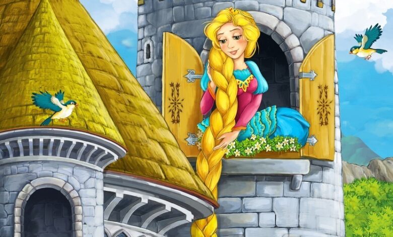 Bebek doğduğunda ona Rapunzel adını vermişler ve bebeği de getirip o kadına teslim etmiş adam. Yaşlı kadın etrafında bir cadı olarak biliniyormuş. Ama aslında kadın hiç çocuğu olmadığından üzüntüsünden o kadar sinirli ve kötü görünüyormuş. Rapunzeli kucağına aldığında bu bembeyaz tenli, elma yanaklı, kiraz dudaklı kız çocuğunu görünce çok sevmiş. Bebeğini kimseler ondan çalamasın diye çok yüksek bir kula yaptırmış. Kulede Rapunzel ile birlikte yaşamaya başlamışlar. Rapunzele sürekli güzel yiyecekler getiriyor, güzel elbiseler alıyormuş. Rapunzelin her görenin hayran olduğu altın sarısı saçları varmış. Yaşlı kadın “Rapunzel kızım sakın saçlarını kesme sana çok yakışıyor” diyormuş Rapunzelde öz annesi bildiği çok sevdiği üvey annesini kırmıyor saçlarını hiç kesmiyormuş. Herkesin cadı dediği kadın Rapunzel ile birlikteyken adeta bir melek olup onunla oyunlar oynuyor ve güzel sarı saçlarını tarıyormuş.